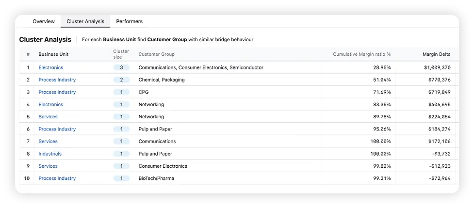 Margin Bridge Analyzer analyzes your sales transaction history using advanced statistical and regression models to identify revenue and margin leaks.