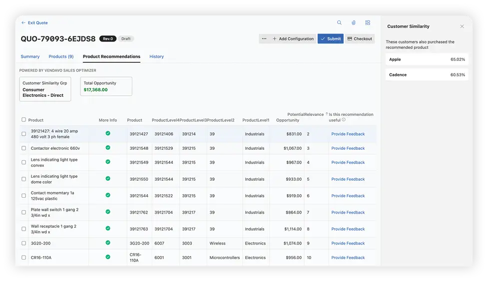 Vendavo Sales Optimizer analyzes your sales history to recommend the right products for each customer. Using advanced machine learning techniques our system predicts customer preferences by leveraging the buying patterns of similar clients