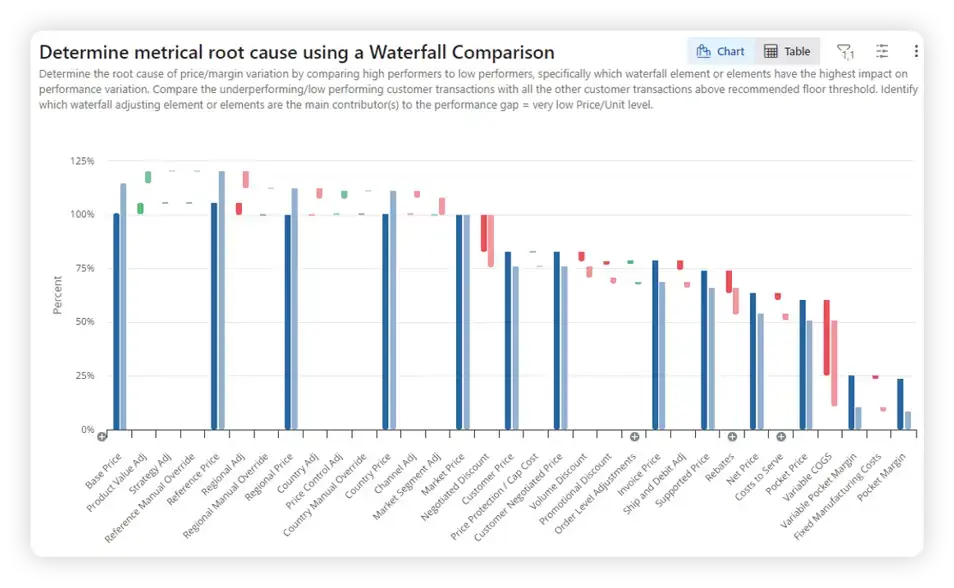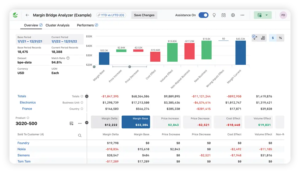 Leveraging your sales transaction history, Margin Bridge Analyzer uses advanced AI techniques to break down the complex dynamics of price, volume, and mix. This textbook concept, often difficult to scale, is made actionable by our AI, revealing hidden patterns in your data to drive smarter decisions and boost profitability.