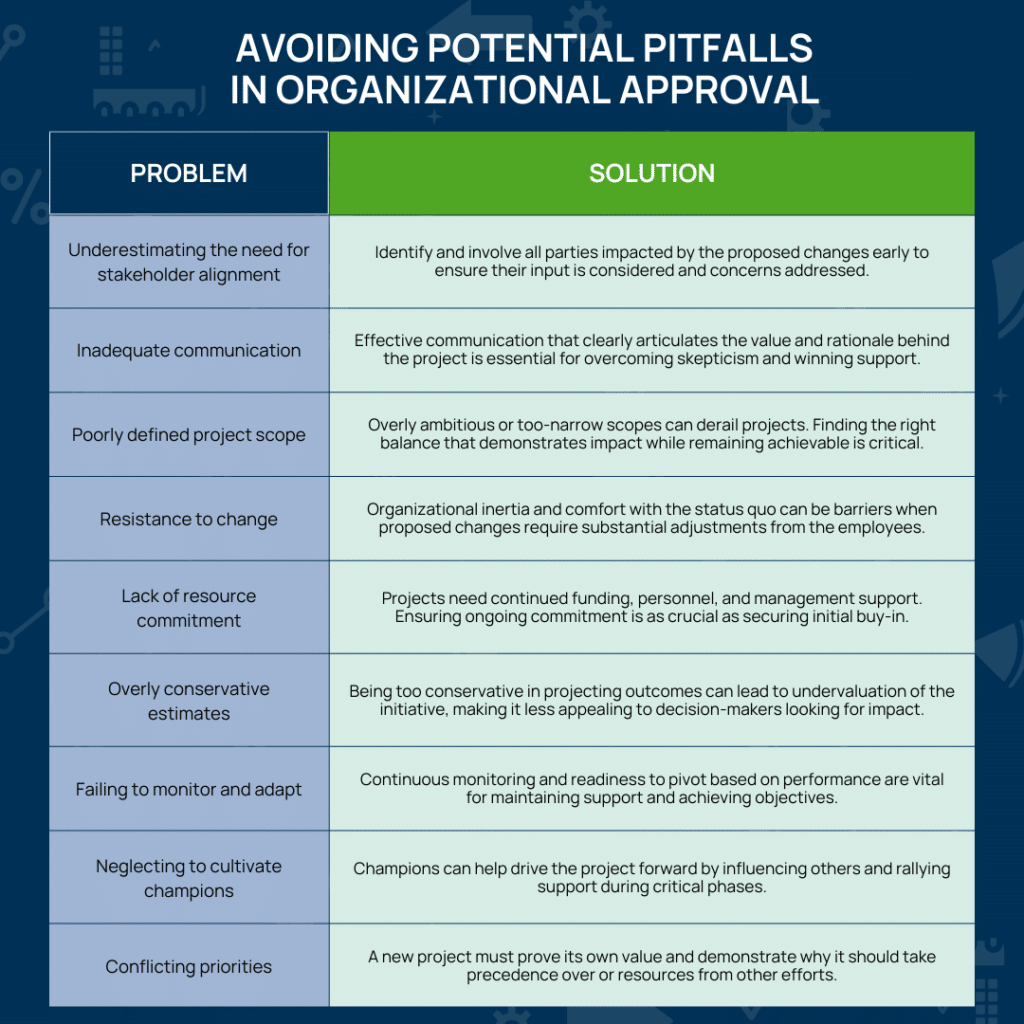 As you move toward organizational buy-in for your project, you’ll likely encounter a little resistance along the way. Here are some key challenges to watch for, plus solutions to ensure they don’t derail your progress: