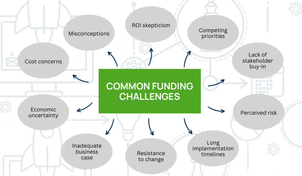 - Perceived risk – Concerns about the potential risks associated with the project can deter funding. Combat this with a thorough risk assessment to help you develop a management plan. Quantify and compare risks, implement pilot projects to test initiatives on a smaller scale, and focus on both long-term benefits and building a risk-aware culture.