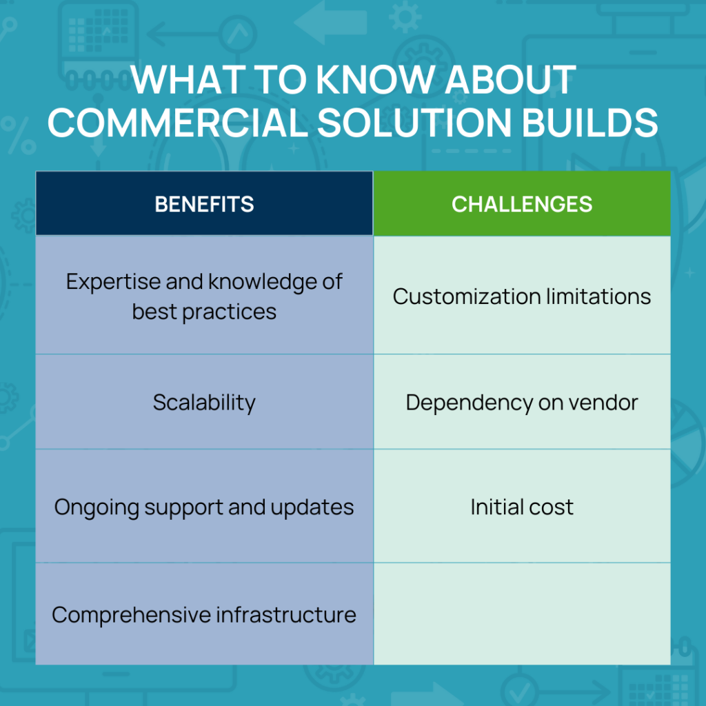 - Limited expertise – does your team have exposure to the industry trends and best practices to create a solution as robust and innovative as commercial offerings?