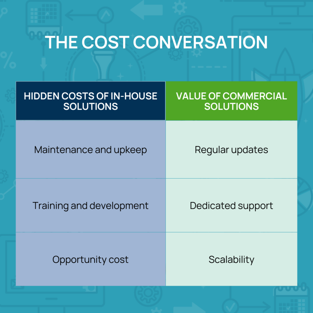A common misconception is that building in-house is cheaper. It might seem more cost-effective up front, but companies often underestimate the long-term investments they’ll have to make in maintenance and support. Commercial software, with its regular updates and enhancements, ensures long-term sustainability and cost-effectiveness.