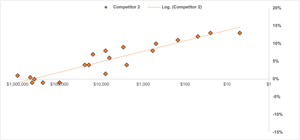 The main takeaway is that Competitor 3 is likely competing on something other than price. Data from this competitor can still be useful when computing an upper and lower bound on your price, but I would take any broad inferences from their data with a grain of salt.