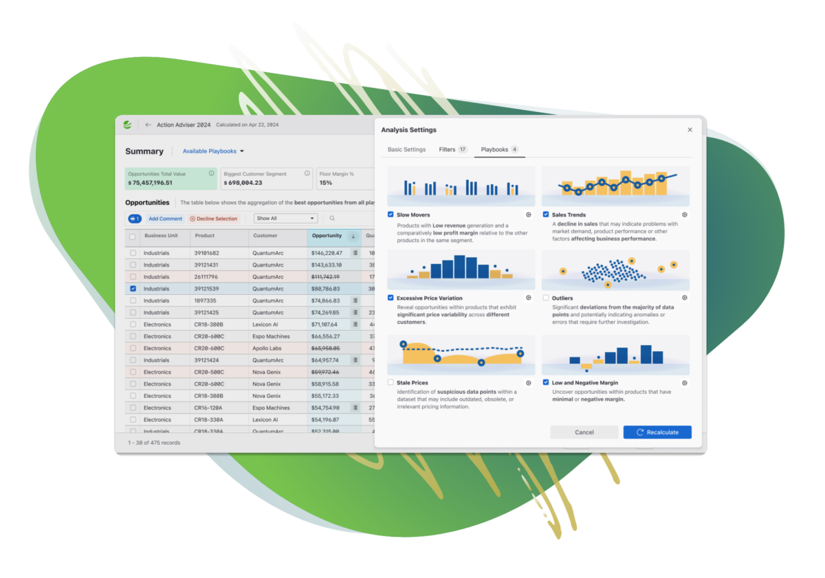 With Playbooks, pricing leaders can easily identify opportunities for margin leakage and then take corrective actions. Improve pricing execution and reduce the time spent on analysis to create a repeatable, predictable, and auditable process