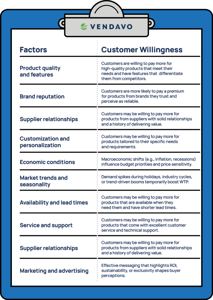 WTP fluctuates based on product attributes, market dynamics, and buyer psychology. Most manufacturers and distributors face these common factors in willingness to pay: